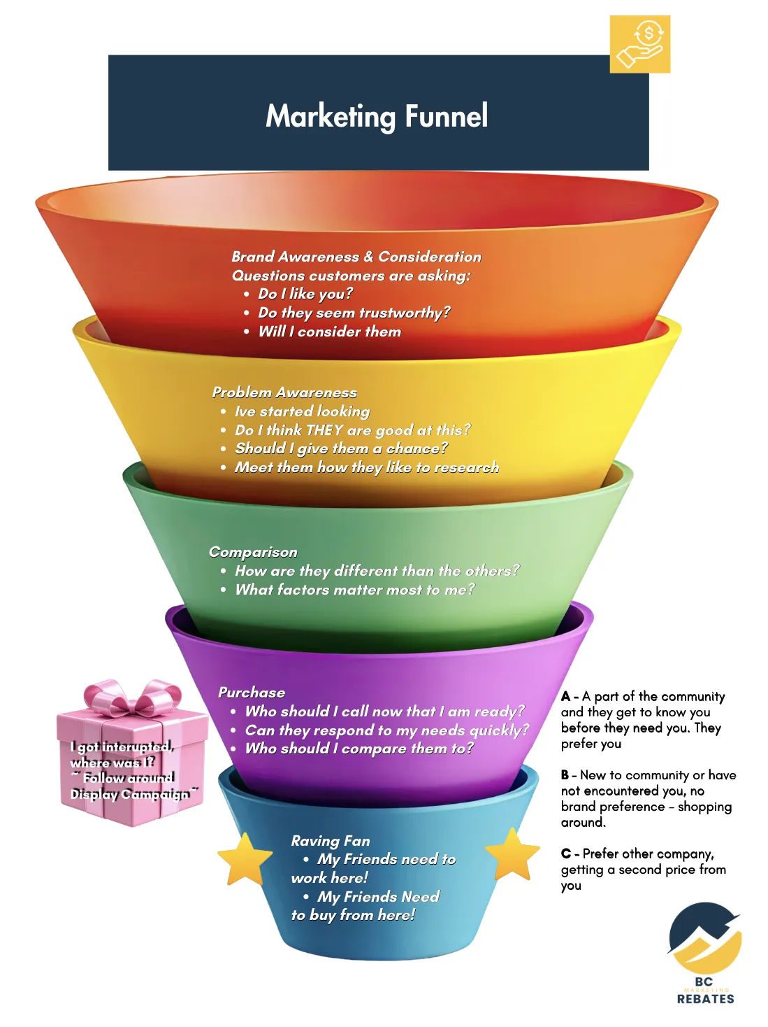 Funnel - The path a customer takes from first seeing you to becoming a paying customer… awareness, interest, decision, and action